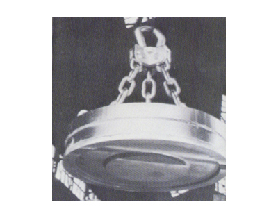 用于吊運大型鋼錠、連鑄板、厚鋼板坯、吊運長度6m以上的板坯時為了避免偏心而產生傾斜,請使用兩臺電磁鐵起吊。